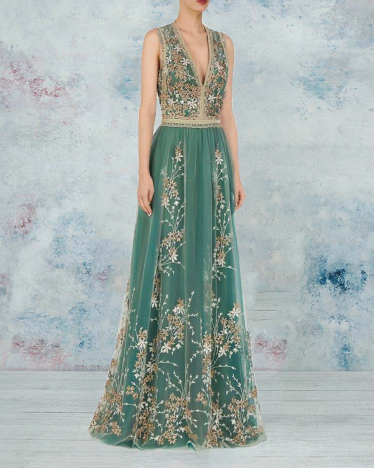 Embroidered V-neck mesh gown dress