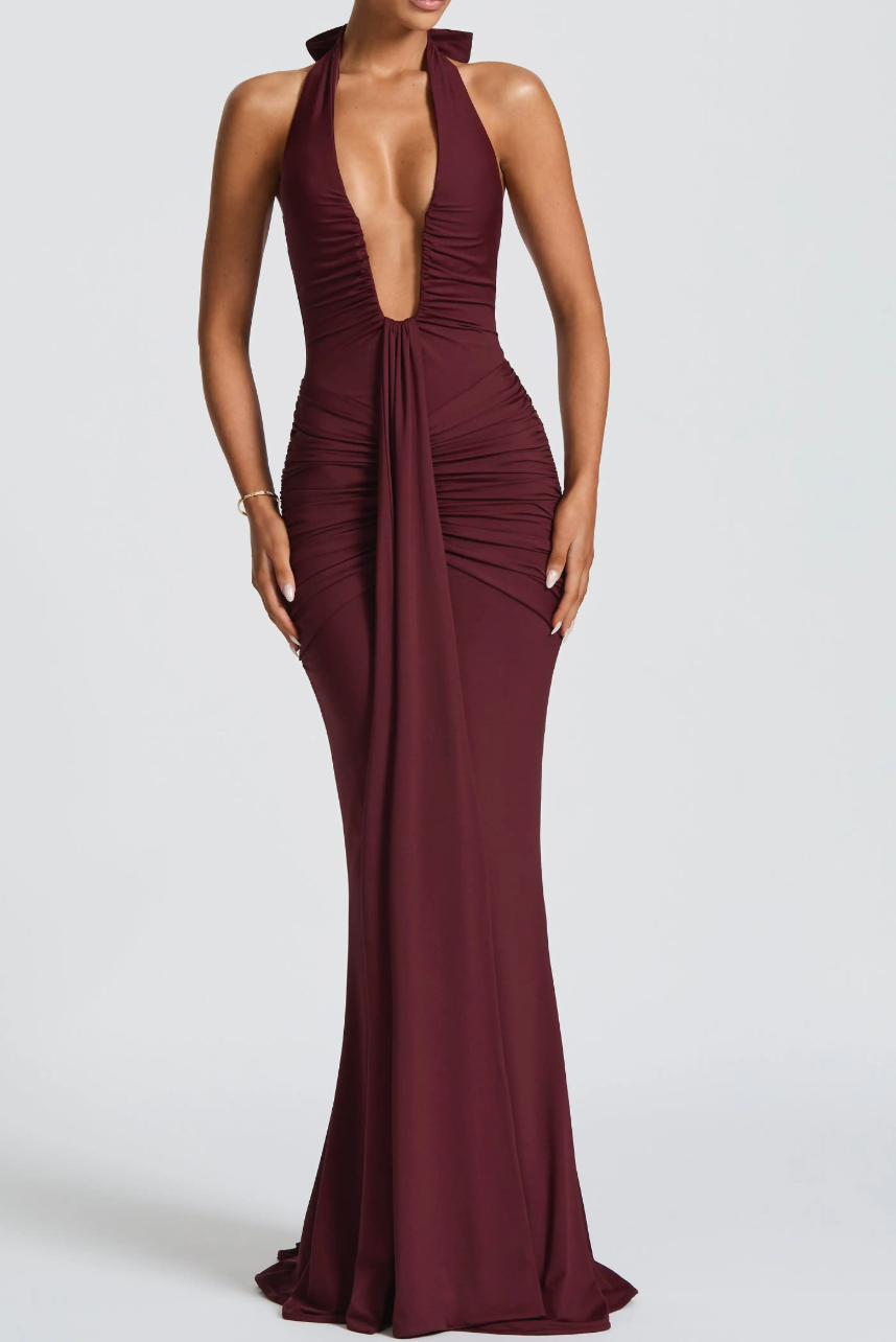 Halter Plunge Neck Ruched Maxi Dress