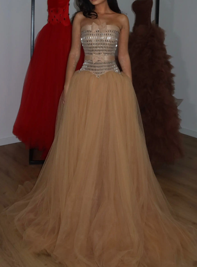 Champagne Strapless Mirror-Paneled Tulle Ball Maxi Dress
