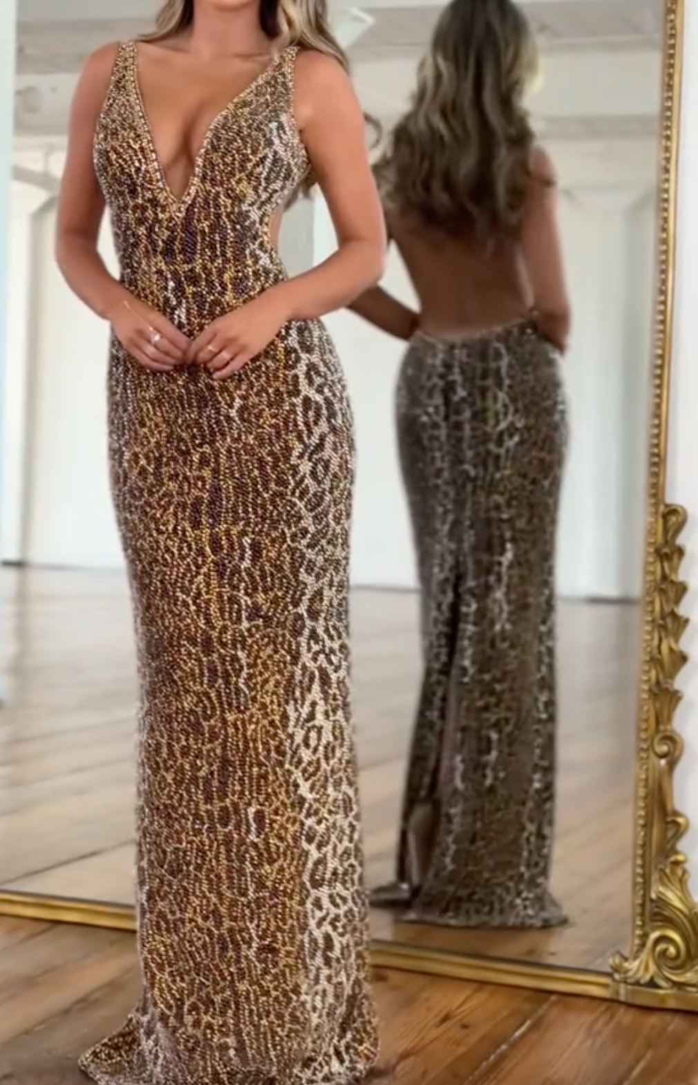 Leopard Sequin Deep V Cutout Backless Fitted Dress