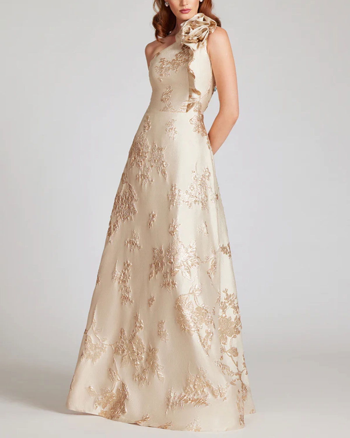 Metallic Jacquard One Shoulder 3D Self Flower Gown